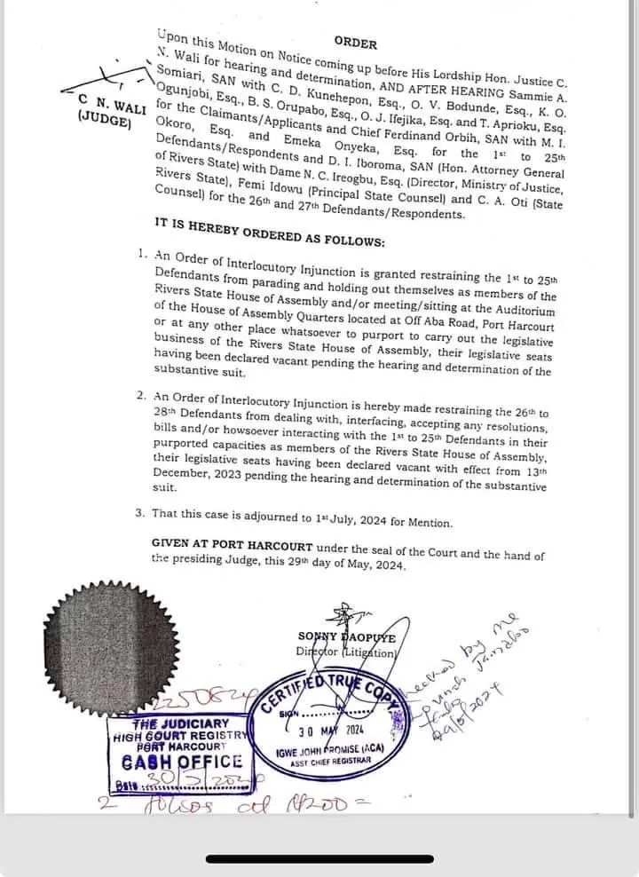 A Rivers State High Court sitting in Port Harcourt has granted an order of interlocutory injunction restraining Martin Amaewhule and 24 other lawmakers from parading and holding themselves as members of the Rivers State House of Assembly.